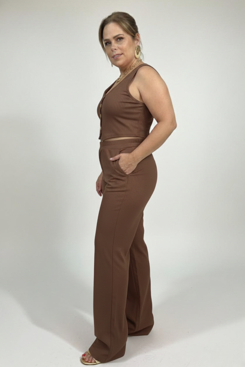 Conjunto Feminino em Riban Crepe, moderno e confortável, com caimento leve e toque sofisticado. A combinação de calça e blusa traz praticidade e estilo para compor looks elegantes no dia a dia.