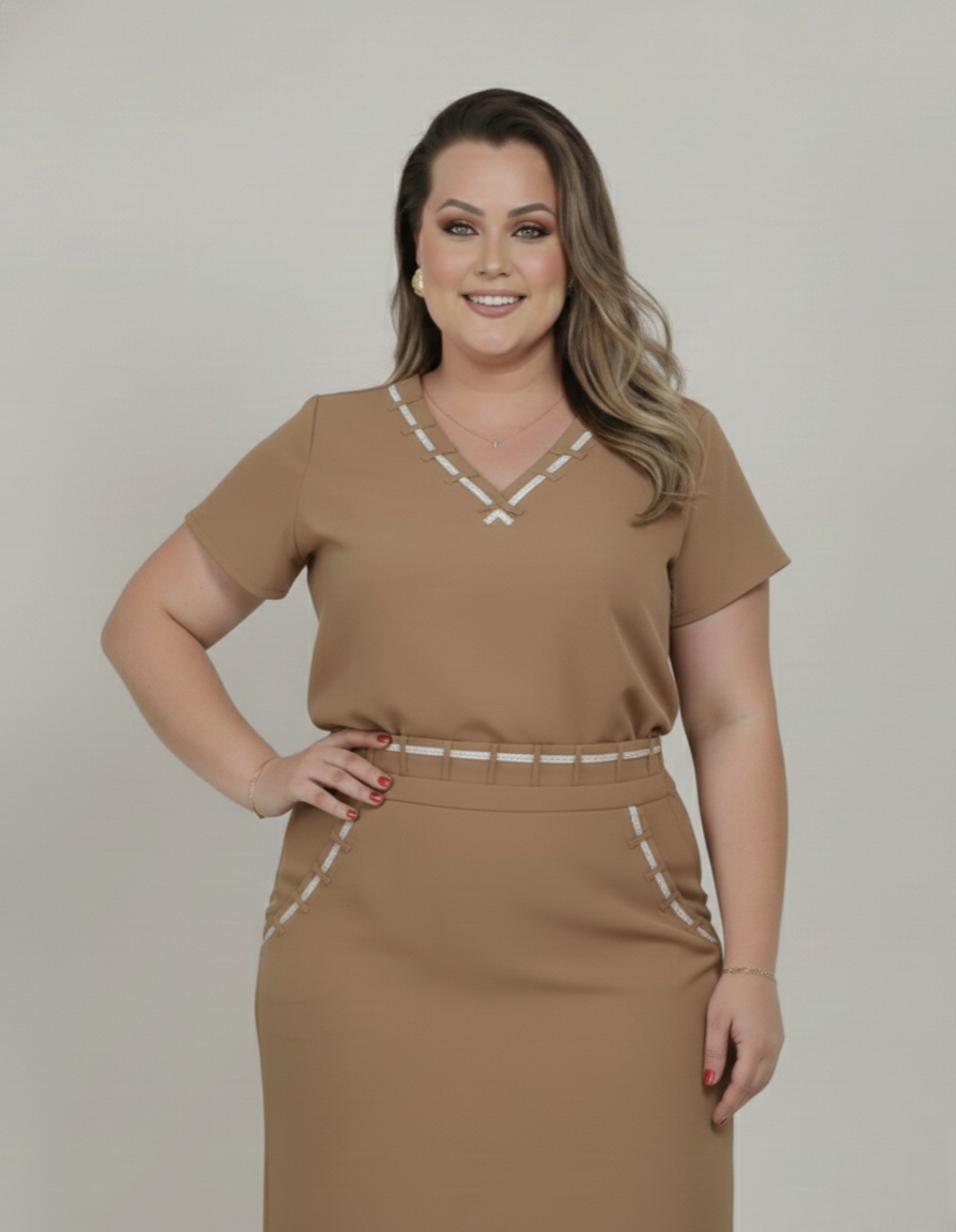 Conjunto em linho composto por blusa e saia com delicados detalhes em viés. A saia possui bolso funcional e elástico nas costas para mais conforto, unindo charme, leveza e praticidade no dia a dia.🌟