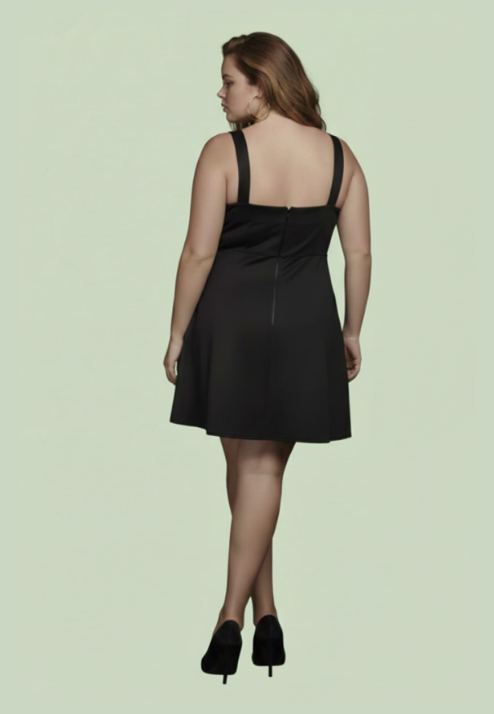 Vestido preto em alfaiataria com acabamento refinado, forro interno e zíper nas costas. Uma peça versátil e elegante, perfeita para produções modernas e sofisticadas.
